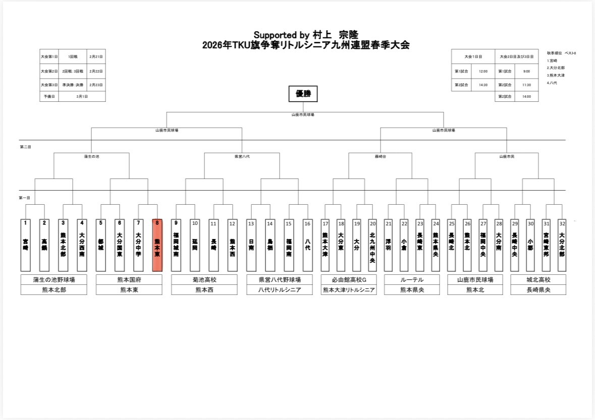 2026年TKU旗争奪リトルシニア九州連盟春季大会の組み合わせが決まりました。
